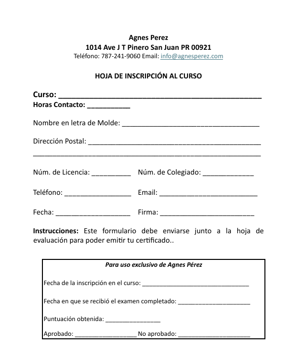 Primero debes bajar la hoja adjunta, completarla y luego enviarla por email a info@agnesperez.com o por mensaje al +1-787-241-9060.